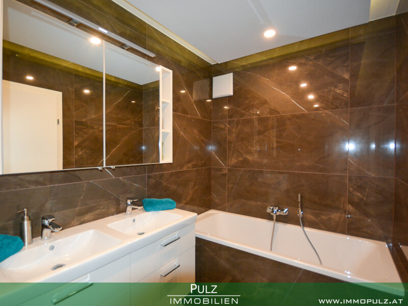 • Bad aus hochwertigen vollflächigen Feinsteinzeug, Duschtrennwand aus Glas, Badewanne