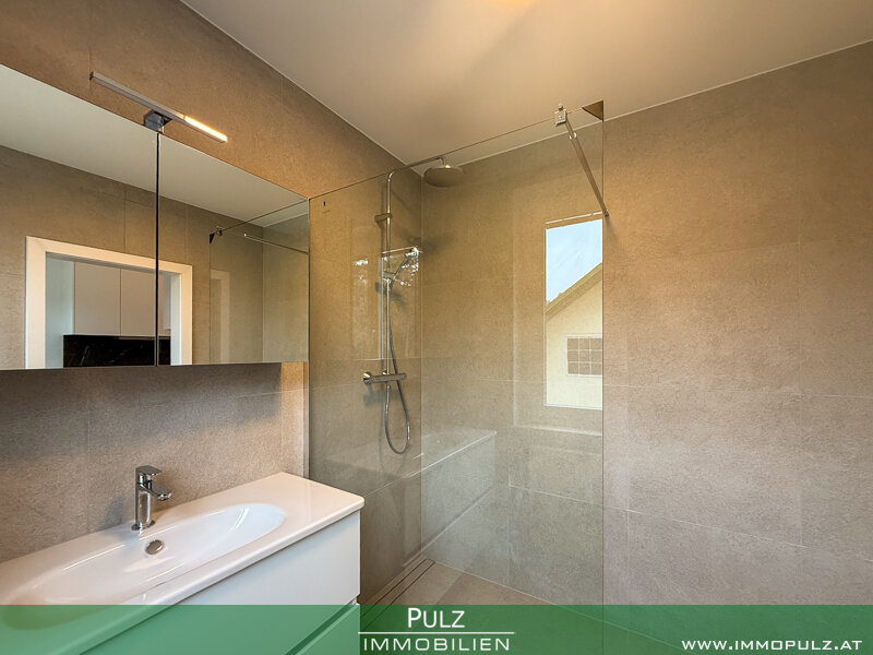 • Badezimmer mit WalkIn-Dusche, Waschtisch mit Unterbau & Spiegelschrank